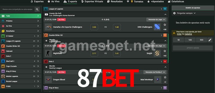 O 87Bet oferece uma grande seleção de opções de apostas em e-sports com probabilidades competitivas